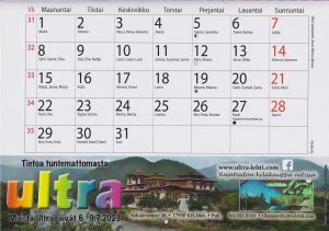 Ultran perinteinen seinäkalenteri. Ultran tapahtumat, terveiset yhteystyökumppaneille, juhlapyhät, liputuspäivät jne. Kalenterin teemana on Isojärven Kansallispuisto Ultran kotikonnuilla Kuhmoisten Kylämällä.