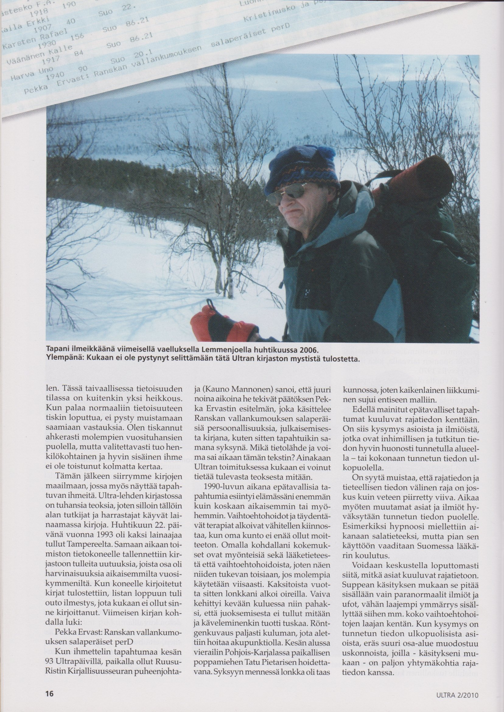 Äiti-Maa -messuilla tapasin hänet viimeksi ja sitä ennen Tapani näytti vanhoja kuvia Ultran kuva-arkistosta ja kertoi ihmisistä tavattoman kiinnostavasti. Tapani teki pitkän elämäntyön rajatiedon parissa, ja siksi häntä voi hyvällä syyllä kutsua Rajatiedon Ylipäälliköksi, puhumattakaan Ufoyhdistyksen perustamisesta aikanaan.