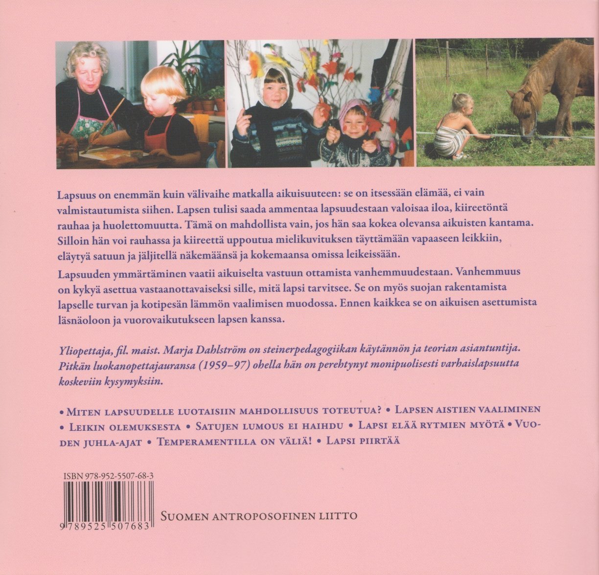 Yliopettaja, fil. maist. Marja Dahlström on steinerpedagogiikan käytännön ja teorian asiantuntija. Pitkän luokanopettajauransa (1959–97) ohella hän on perehtynyt monipuolisesti varhaislapsuutta koskeviin kysymyksiin.
