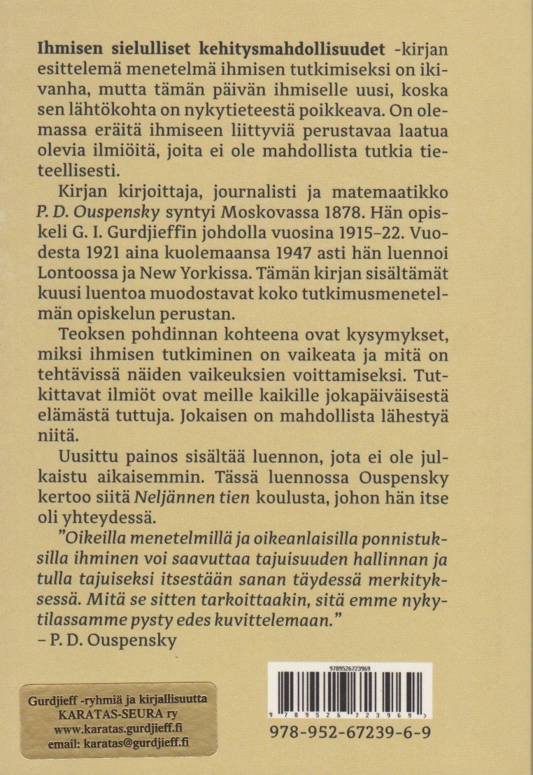 Kirjan kirjoittaja, journalisti ja matemaatikko P. D. Ouspensky syntyi Moskovassa 1878. Hän opiskeli G. I. Gurdjieffin johdolla vuosina 1915 – 22. Vuodesta 1921 aina kuolemaansa 1947 asti hän luennoi Lontoossa ja New Yorkissa. Tämän kirjan sisältämät kuusi luentoa muodostavat koko tutkimusmenetelmän opiskelun perustan.