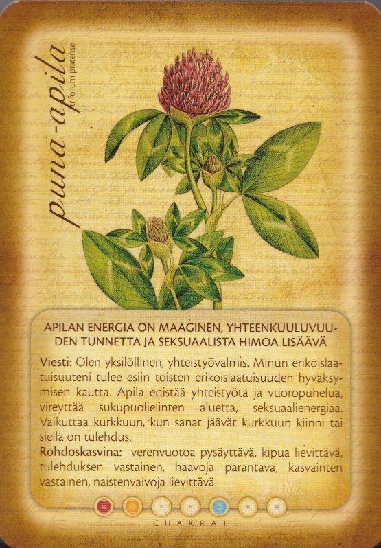 Katso, minkälaisen tunteen kasvi sinussa herättää. Tuntuuko siltä, että kasvi ”puhuttelee” sinua? Jos tunne on hyvä ja kutsuva, kasvi haluaa tulla osaksi polkuasi. - Tutki kortin viestiä.