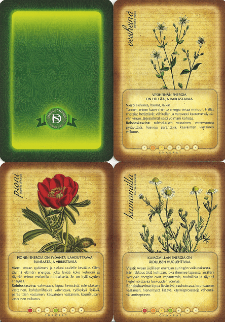 Tarkkaile kasvia huolellisesti yrittäen ymmärtää millainen tunne syntyy ”puhuuko” kasvi sinulle jotakin. Jos sinulle syntyy hyvä tunne, olet päässyt kasvin kanssa ”puheisiin”ja se haluaa tulla elämääsi. Korteista löytyy kunkin kasvin viesti, energeettiset ominaisuudet, tietoa rohdoskäytöstä sekä chakrat, joihin kasvi vaikuttaa.