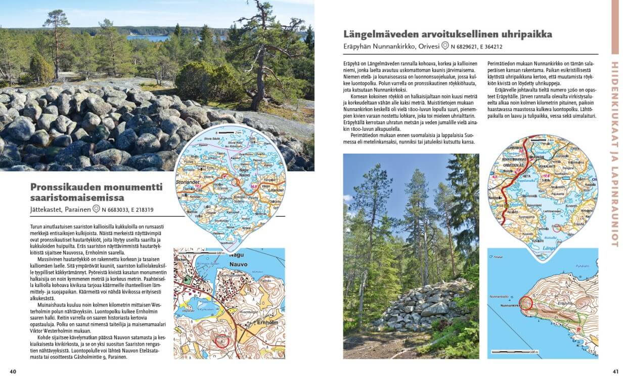 Jännittävät tarinat heräävät eloon retkillä Suomen upeimmille jätinkirkoille, hautasaarille, linnavuorille, rangaistuspaikoille ja monille muille muinaiskohteille. Tuomo Kesäläinen on tutustunut ja kuvannut ympäri Suomea satoja esihistoriallisia asuinsijoja, kalliomaalauksia, palvonta- ja hautapaikkoja sekä muita ihmistoiminnan merkkejä ja koonnut niistä näyttävimmät mainioksi retkeilykirjaksi. Laadukkaat kartat johdattavat perille kulttuurin alkulähteille. Suomen upeimmat muinaiskohteet on jatkoa vuonna 2020 ilmestyneelle suositulle Suomen upeimmille luontokohteille, ja yhdessä ne muodostavat mahtavan päiväretkeilijän kohdevalikoiman.