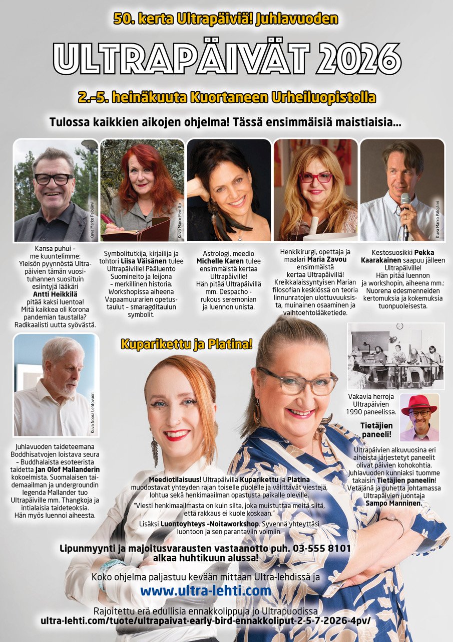 Tämä lippu sisältää kaiken Ultrapäivillä 2.-5.7.2026 pidettävän ohjelman: kaikki luennot, workshopit, meditaatiot, taidetta jne.
